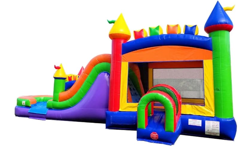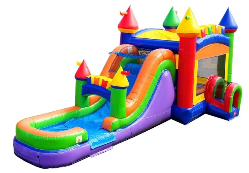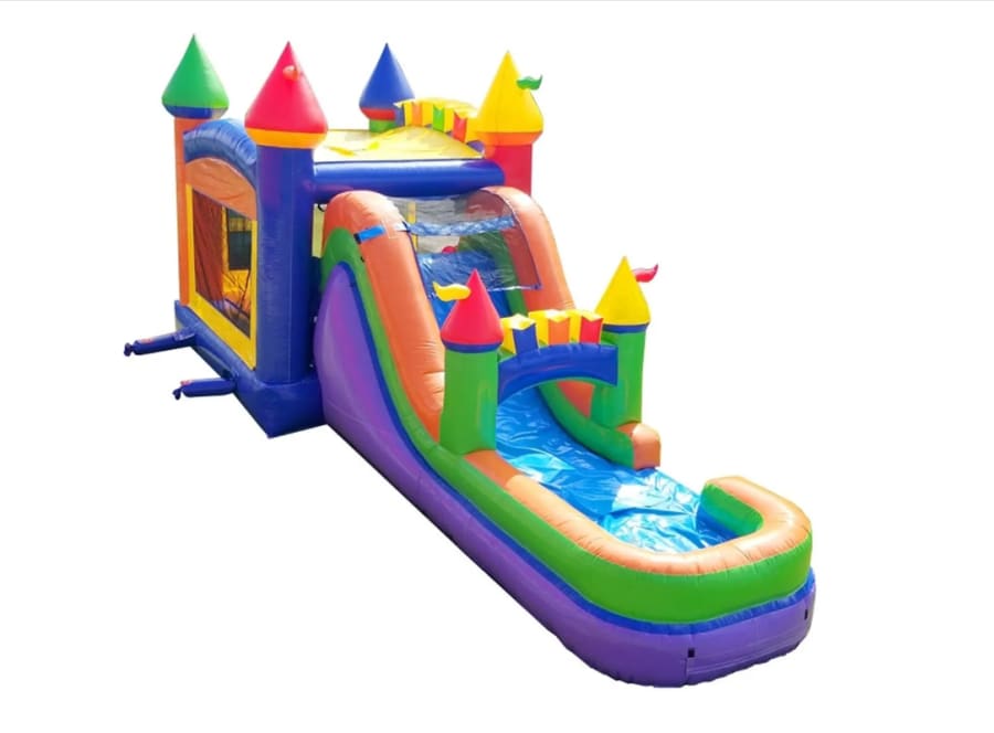 Take the fun and excitement of jumping and playing in a water slide bounce house and MEGA SIZE it with the Mega Modern Rainbow Water Slide Bounce House Combo! From their bright, vibrant colors, to the spacious bouncing area and incredibly fun big slide, kids can't help but look at these units in awe. This unit stretches out for 32' feet of fun, exciting activities that may even have a few parents secretly wanting to jump in! Crawl into the bouncing area through our upgraded, enclosed tunnel entrance. Have a blast jumping, bouncing and laughing the day away on this mega bouncer! Climb up the short rock climb wall to get a view of the flowing water down the slide. Get ready, then head down into the splash pool at the bottom for a grand finale and some photos for the scrapbook! The Mega Modern Rainbow Water Slide Bounce House Combo brings everything needed to the party to have a great time, and fill it with all the joy that kids (and adults!) want on a fun, exciting and memorable play day.